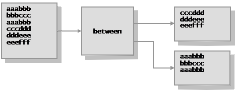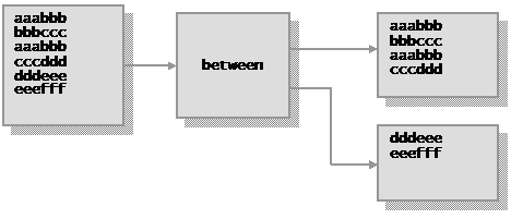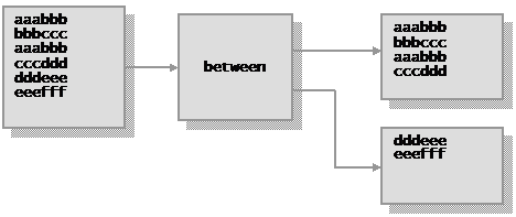 Use the BETWEEN stage to select groups of records from its primary input stream, starting with the first record that begins with the specified string fromstring. BETWEEN writes a group of records to its primary output stream, ending a group with the record that has the second specified string tostring, or with all remaining records once the specified number of records is reached.