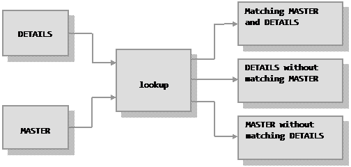The records in the secondary input stream are the master records. LOOKUP first reads the master records into a buffer, where records with duplicate key fields are discarded; the first occurrence of a key field is retained. The records in the buffer are referred to as the reference. The records in the primary input stream are the detail records. LOOKUP compares detail records to records in the reference.
